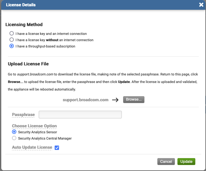 The system will need to be running 8.2.5 or later to use the Throughput license. Determine which license you are now using. If you will be using the new Throughput license, you will need to download the license from your Broadcom Support portal and apply it. The system will reboot when applying the license.