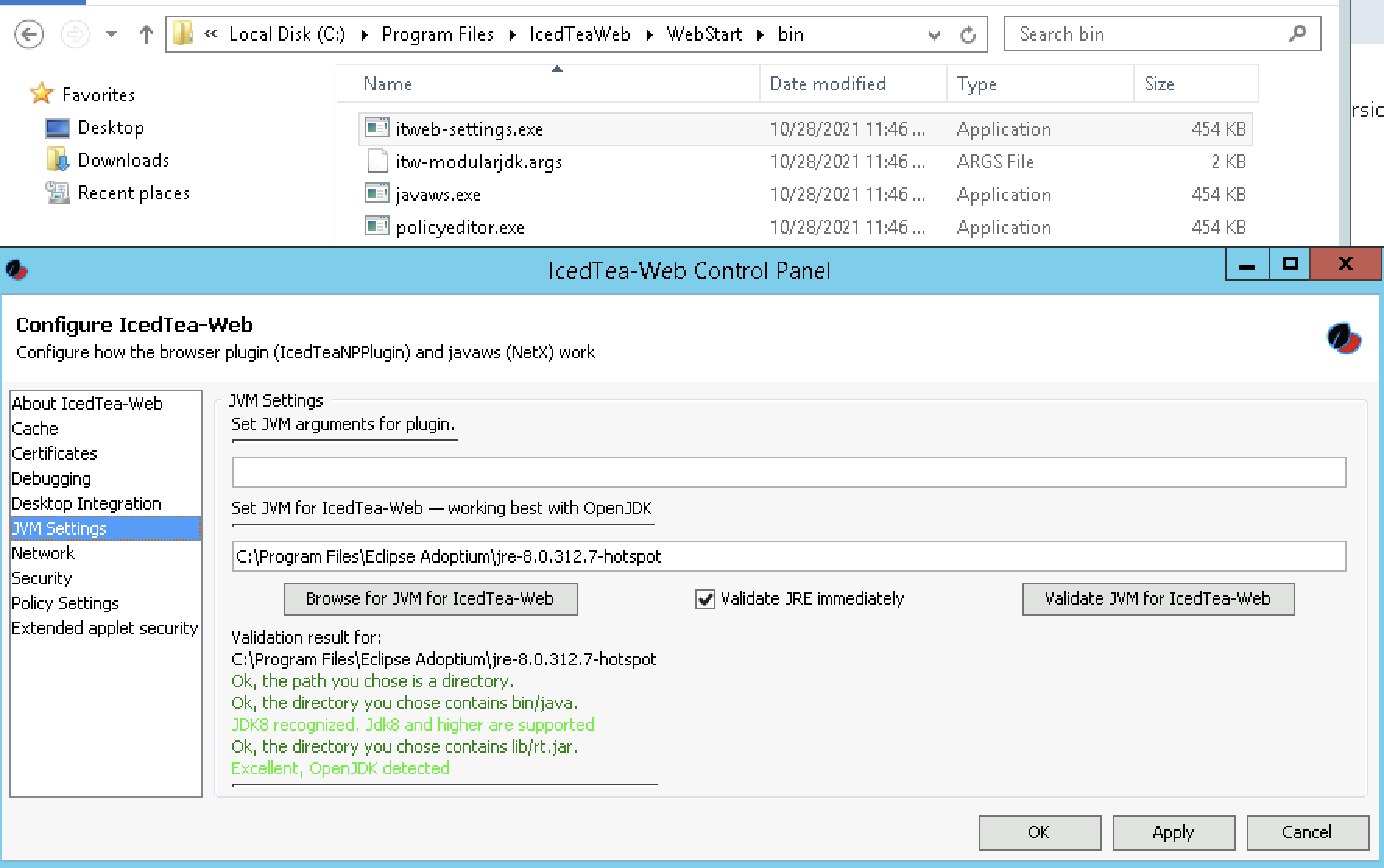 You can verify via task manager that IcedTea Webstart (javaws.exe) and Eclipse Adoptium (java.exe) are being used: