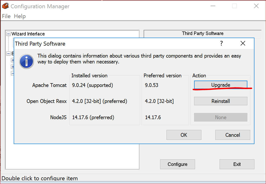 The Automation Point configuration manager app can be used to upgrade the Apache Tomcat. Go to Expert Interface => Infrastructure => Third Party Software, double click, on the pop-up window like in the screenshot below click Upgrade, and follow installation wizard instructions.