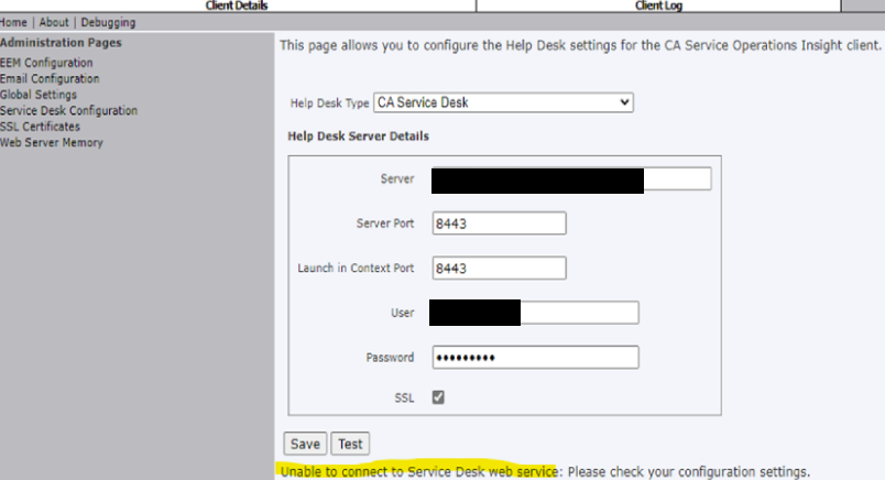 Error: Unable to connect to Service Desk web service: Please check your configuration settings.