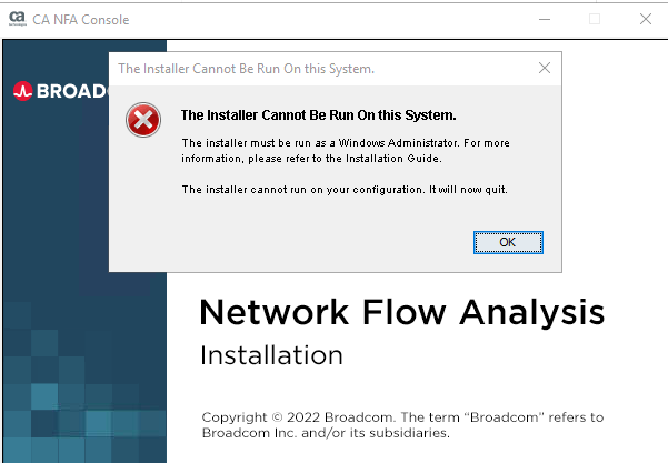 While attempting to launch the Network Flow Analysis Console installer or upgrade, you may run into this error message even if running with an administrator privilege user and / or right clicking and running as administrator which closes out the installer.
