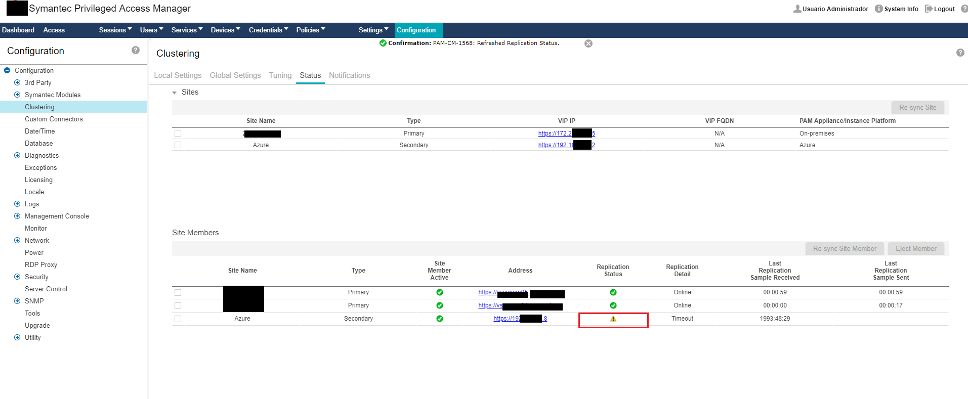 "Replication Status" column in PAM as "!" with Alert "The connection timed-out checking whether this member's database is consistent with the primary database. This sync status is checked every 5 minutes. Click on the Refresh Replication Status button to check it now". We were clicking but keeping in the same "Replication Status" state.