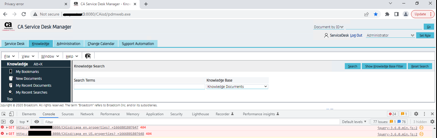 Starting from RU 16, errors appear in the F12 Developer Console and Network tabs related to missing capa_en.properties/capa_en_US.properties (In Portuguese env the file is capa_pt.properties) files being called. Checking the NX_ROOT\bopcfg\www\wwwroot folder, only the capa.properties file exists.