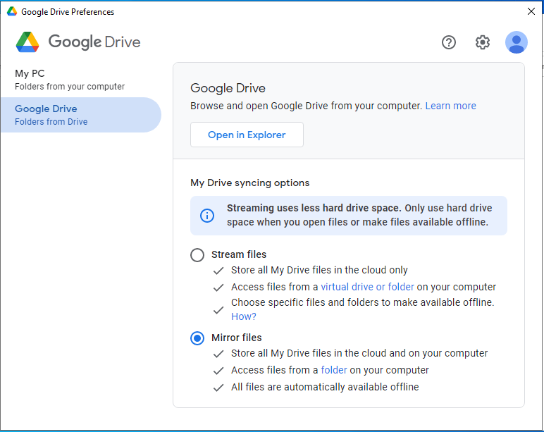 In the preferences dialog box Select Google Drive "Folders from Drive" and select Mirror files.