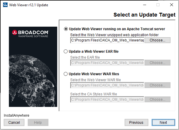 During the application of a CUMULATIVE BUILD you will be prompted to "Select an Update Target, Update Web Viewer running on an Apache Tomcat Server.......