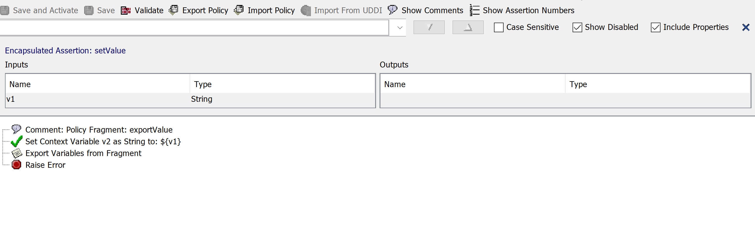 Assume that in the above example Export Variable from Fragment assertion, v2 is checked, that means the fragment is trying to export the context variable ${v2} value.