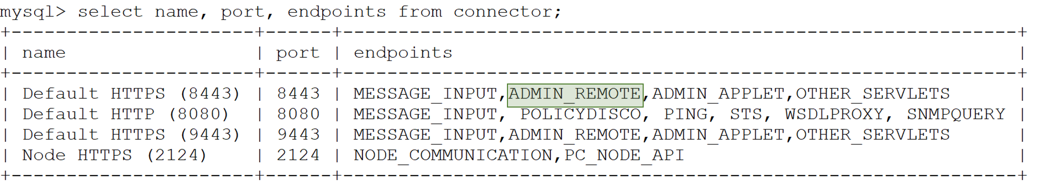 UPDATE connector SET endpoints = 'MESSAGE_INPUT,ADMIN_REMOTE,ADMIN_APPLET,OTHER_SERVLETS' WHERE port = '8443';