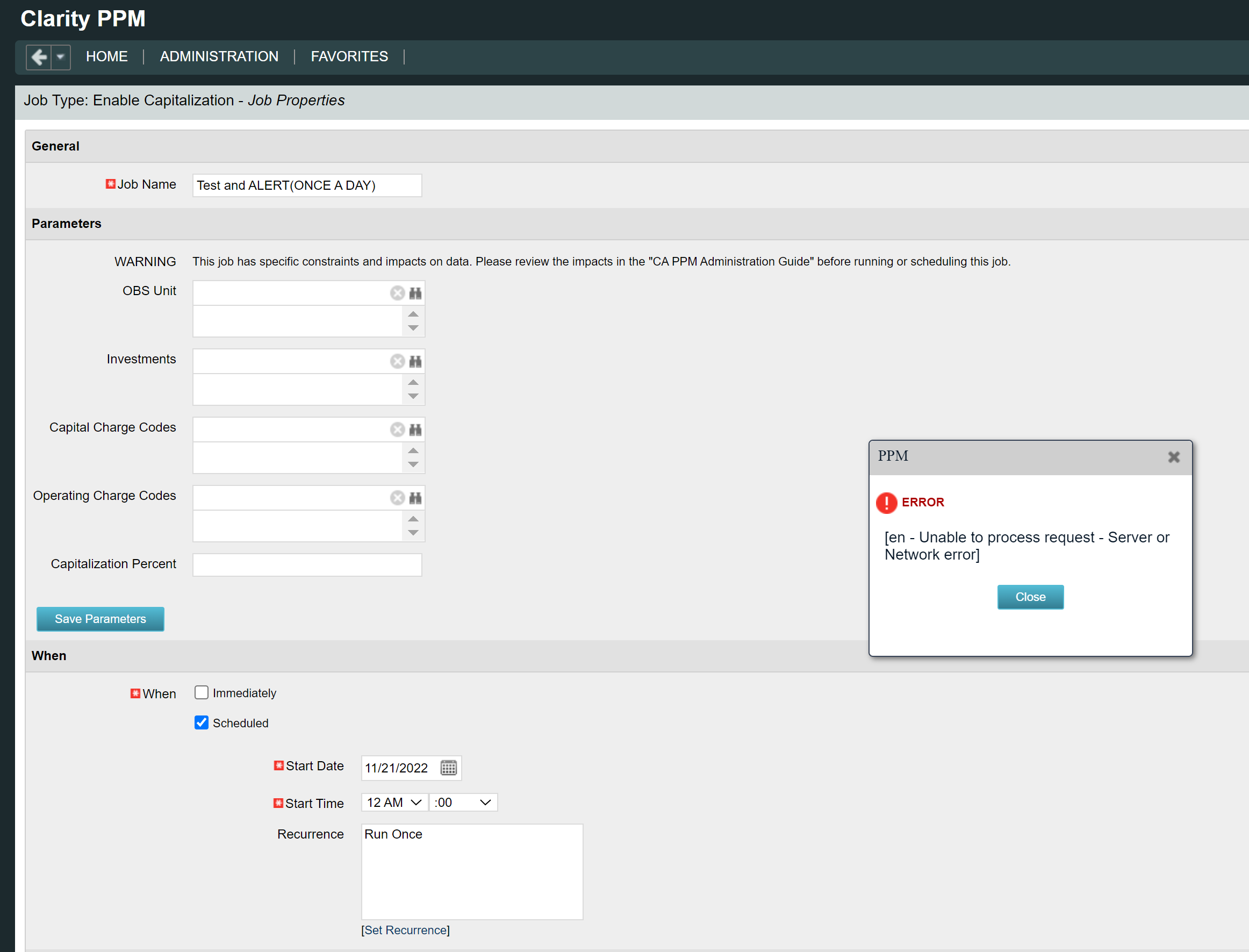 Clarity does not allow scheduling a recurring job when the job name has string pattern 'ALERT (xx)'