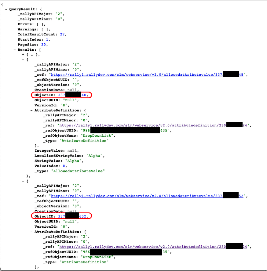 To get the AllowedValues, you would append /AllowedValues to the object ID I have circled above: https://rally1.rallydev.com/slm/webservice/v2.0/AttributeDefinition/<OBJECT_ID>/AllowedValues