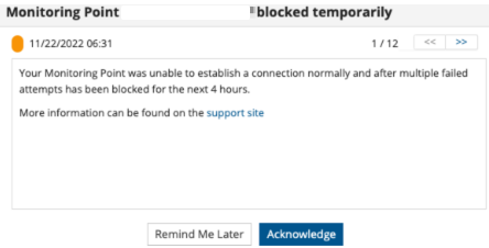 You may encounter a problem a monitoring point in your organization which appears to be unable to connect, and gives an error message suggesting a blacklist: