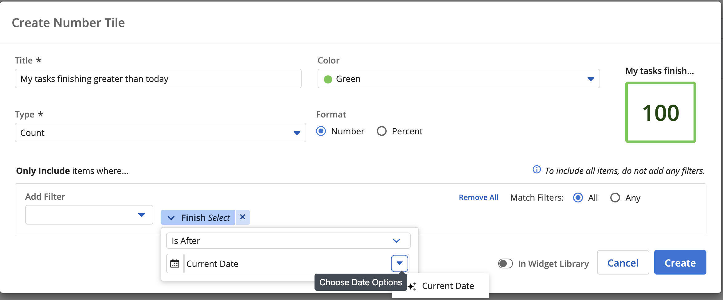Current date can be selected from the choose date options drop down menu next to calendar icon. Relative Dates functionality applies for Smartlists, Filters, Business Rules, and Widgets.