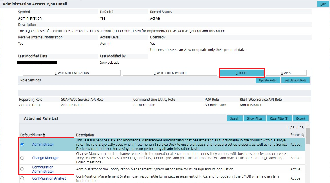 4. In the given Access Type, review the Attached Role list (under the Roles tab) to confirm the role of interest that will be attached to the given app is present. In this case, we verify "Administrator", "Change Manager" and "Configuration Administrator" are present. If the roles are not listed here, they cannot be added to the application.