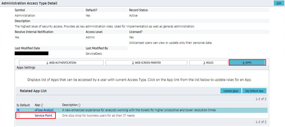 5. Choose the "Apps" tab, then choose the app of interest, in this case, "Service Point"