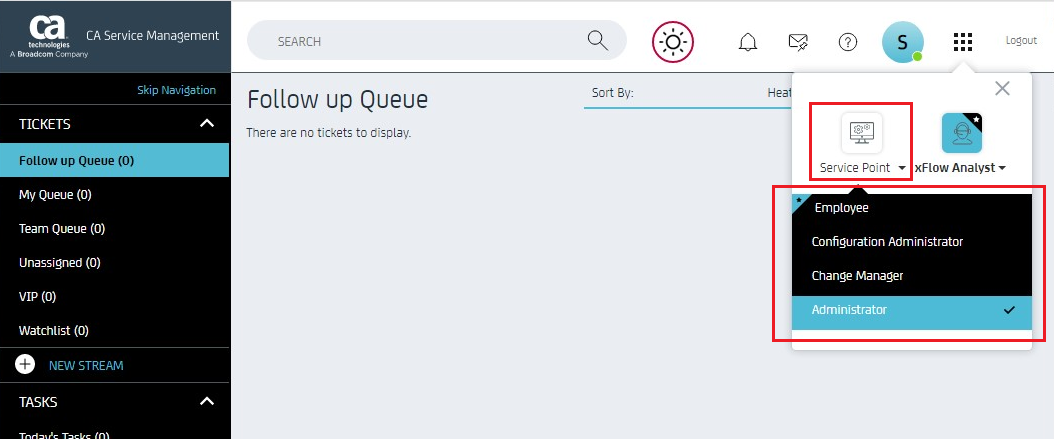 Example: The given end user logs into xFlow and sees that they can select under the xFlow app and can choose "Administrator" and "Level 2 Analyst". Service Point does not have any role options. Objective is to add additional roles into Service Point alongside the default "Employee" role. The roles will be "Administrator", "Change Manager" and "Configuration Administrator".