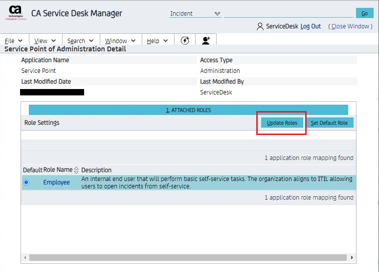 6. In the screen showing "Service Point of Administration Detail", click "Update Roles"