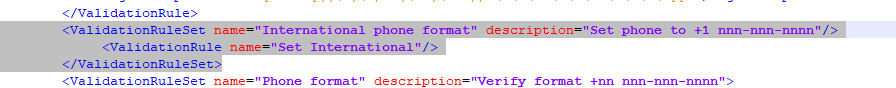 The out of the box Validation Rule for International phone format should be set to <ValidationRule name="Set International"/> and needs a closing tag </ValidationRuleSet>
