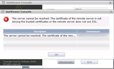 The server cannot be reached: The certificate of the remote server is not among the trusted certificates or the remote server does not use SSL.