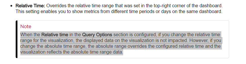 When the Relative time in the Query Options section is configured, if you change the relative time range for the visualization, the displayed data on the visualization is not impacted. However, if you change the absolute time range, the absolute range overrides the configured relative time and the visualization reflects the absolute time range data.