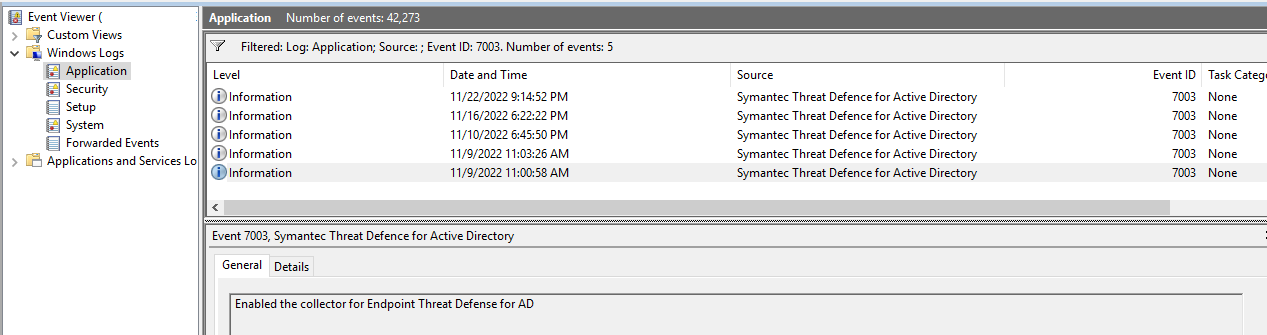 Source: Symantec Threat Defense for Active Directory. Event ID 7003. Message: Enabled the collector for Endpoint Threat for Defense for AD.