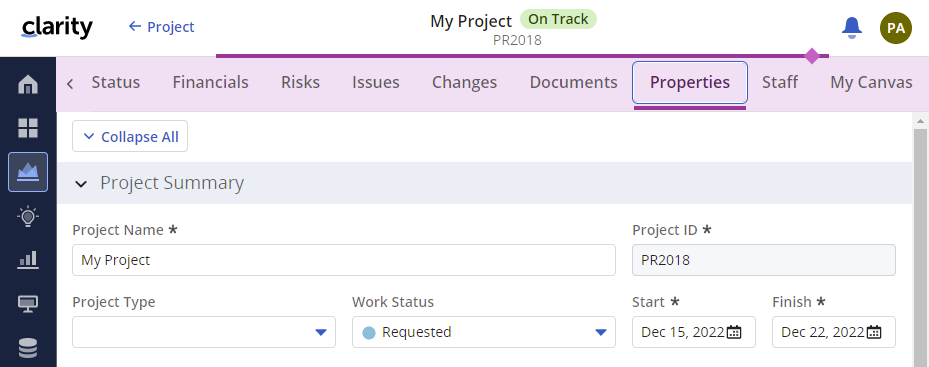 - Open the Properties module (or other non-Canvas modules). Project Status and Milestones are displayed on top.