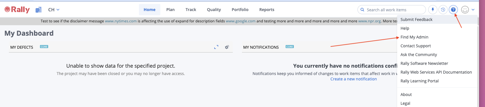 Select "Find My Admin" from the Rally Help Menu (Question mark in the top left corner of any Rally screen) to see a list of administrators for the current project, along with their email addresses.
