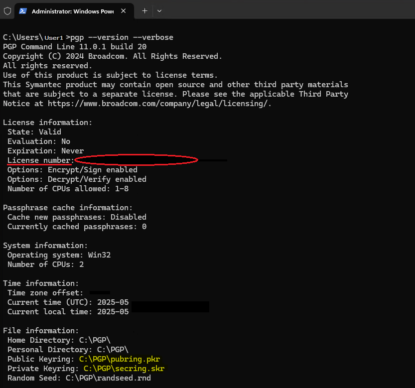 Tip: To locate the keyring files, use the following command, which will also show you your license number that will also be used: