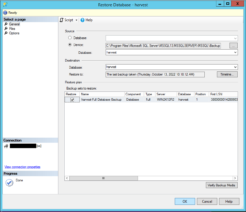 On the Backup Database window ensure the correct database is selected, the Backup type is “Full,” the Backup component is “Database”, the Backup option is “Disk,” and a valid folder location and the name is selected for your database backup file. Click OK.