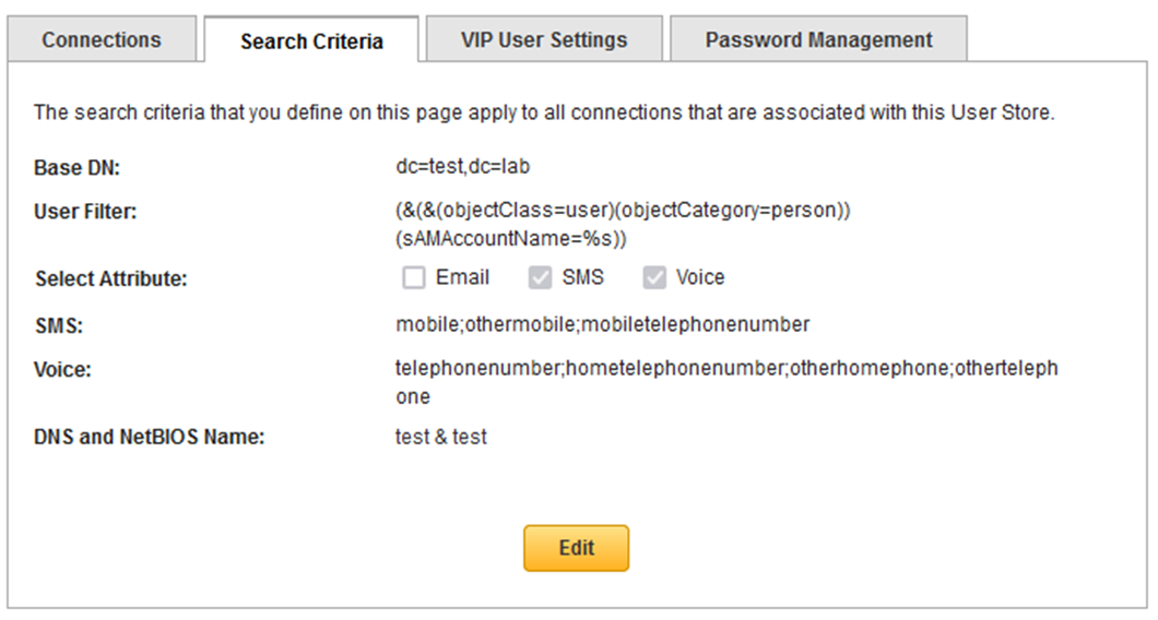 - For Voice OTP to take precedence, disable SMS OTP in VIP EG (User Store tab > Search Criteria tab, and untick SMS in ‘Select Attribute’)