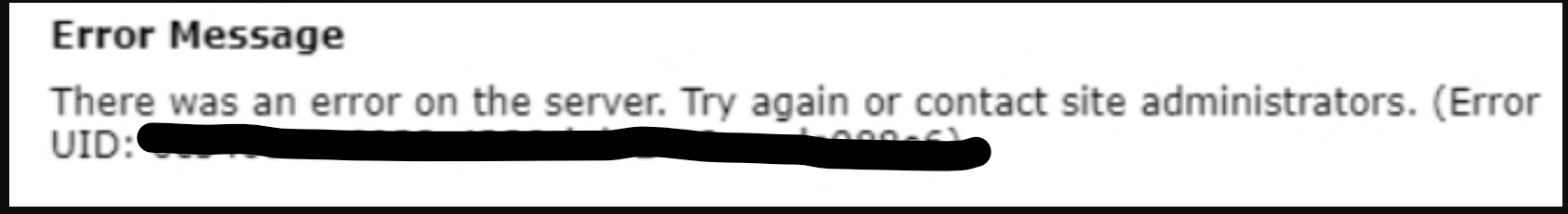 2023-01-16T08:37:24,328 ERROR SecureExceptionHandlerImpl,pool-14-thread-7:116 - There was an error on the server. Try again or contact site administrators. (Error UID: 6c5408c8-6033-4238-bd72-09eaade988e6)