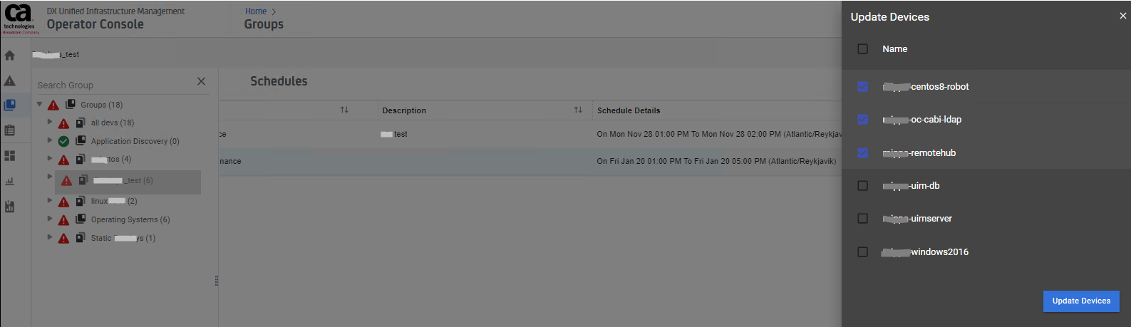On the example below, the selected devices on the right show the devices that are in maintenance for the selected maintenance.