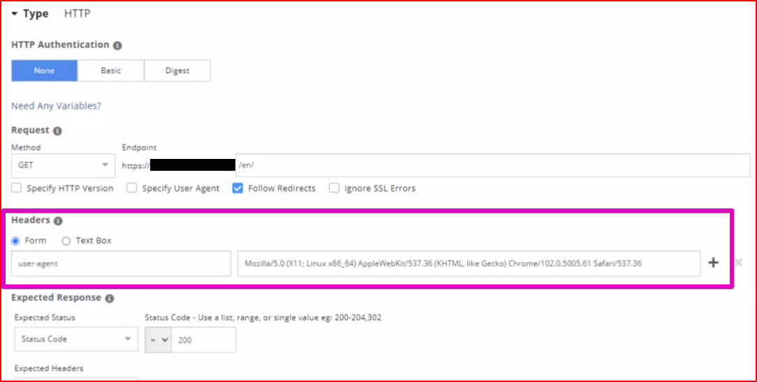 It may be required to manually set the User Agent String of HTTP Monitoring due to various reasons such as curl being actively prevented from connecting to the web application or simply a necessity to manually manipulate it.