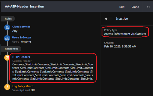 The hard size limit of the "Header Insertion" action in Access Enforcement Policy is 8K (8,192B).