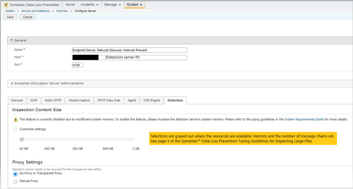 To adjust the content inspection size, configure a detection server using the Enforce Server administration console at