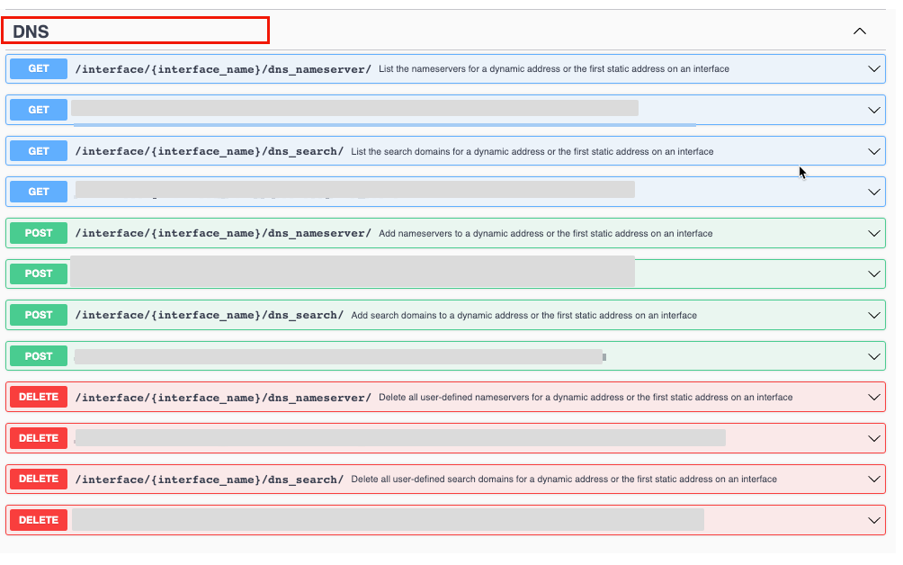 curl -X 'POST' \ 'https://10.10.10.27/api/v1/interface/eth0/dns_nameserver/' \ -H 'accept: application/json' \ -H 'Content-Type: application/json' \ -d '{ "family": "inet", "dns_nameservers": [ "1.1.1.1","8.8.8.8" ]}'