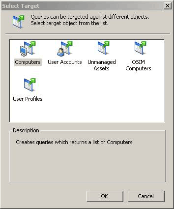 - In the 'Select Target' window select the object on which you want to create a query and click OK. Ex: Computers.