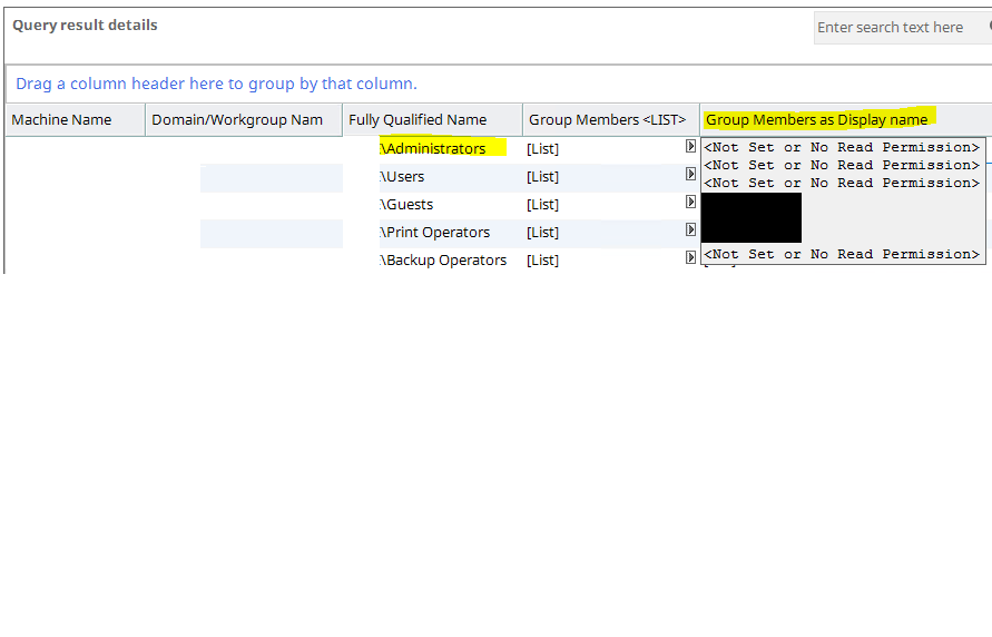 When you run a CCS query for local group membership, and the query runs successfully without errors, but you view the results of the query the 'Group Members as Display Name' column shows '<Not Set or No Read Permission>' for some of the users or groups.