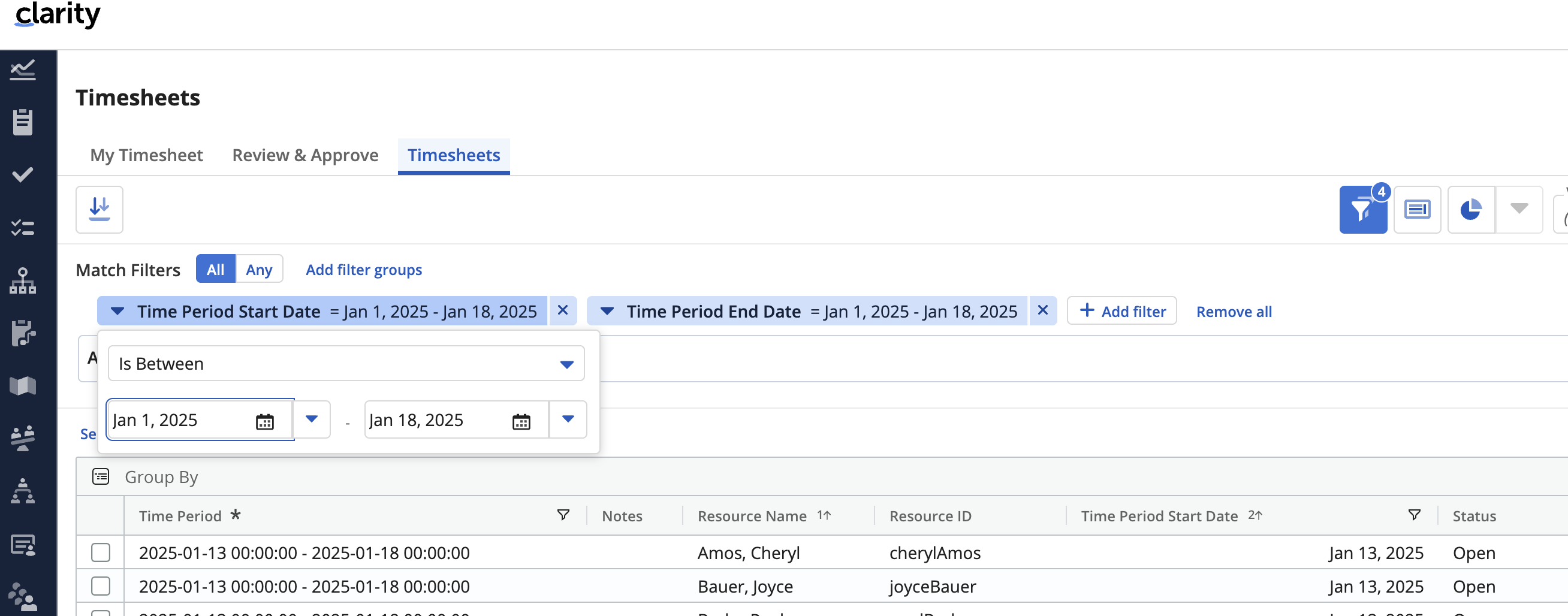 The New Time Period filter in Timesheets screen does not allow you to search for a time period using expected format. In 16.1.1 added a time period filter that is mandatory that is by default set to current.