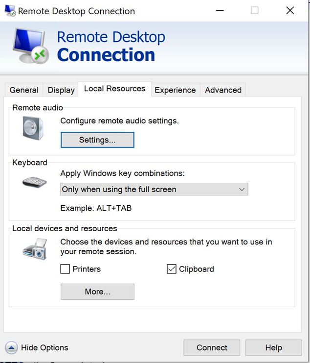Verify the Local Resources setting in the RDP Connection is set to 'on the remote computer'. Confirm that 'Clipboard' is enabled as well: