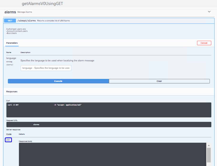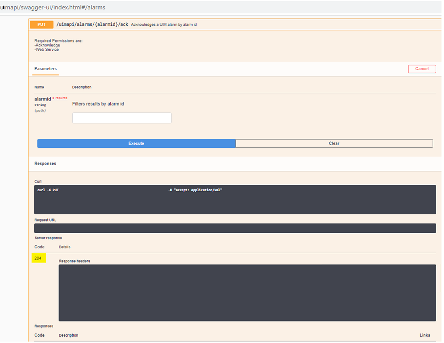 A simple test you can run in the uimapi is to get all alarms, Click the Get button, then "Try it out" then "Execute the call.