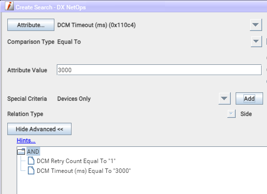 Use Locater to create a new search that will find all device models where the DCM Timeout equals 3000 (ms) and the DCM Retry is set to 1. Be sure to set the search to "Devices Only"