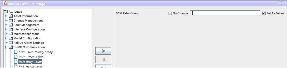 Select all and right click, Utilities - Attribute Editor - SNMP Communication. Move the DCM Retry Count to the right. Set value back to the default value of 3 on the existing device models and set the "Set As Default" so any future models will be set to 3 as well.