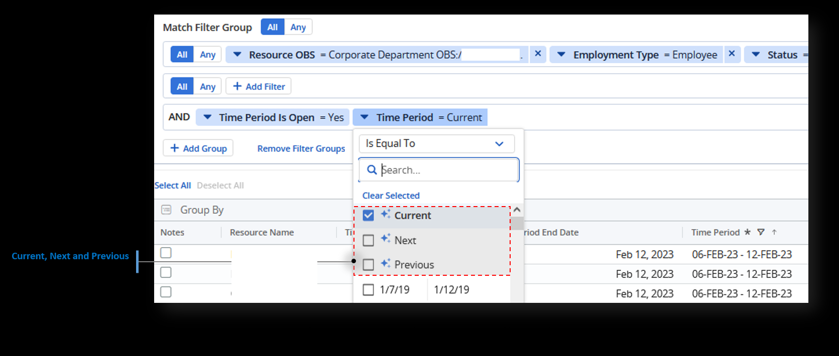 The Time Period filter offers three options in the list: Current, Previous and Next. You can use these periods while filtering the data in the Timesheets grid. These options are also available in Time Period filter of Widget.