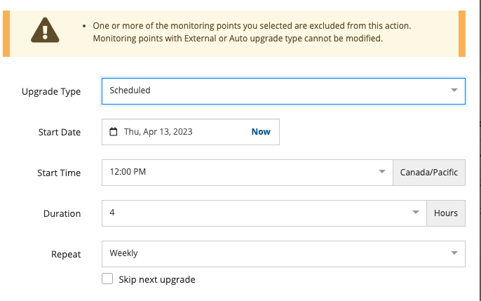 Native Monitoring Points do not support scheduled upgrades, but instead are set to Auto - which will allow updates to be automatic, or, the can be set to External - which allows updates to be managed by an external system.