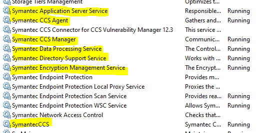 When stopping the CCS Application Server Services, start from the top of the list of Services (as shown in the screenshot above) at the 'Symantec Application Server Services' and proceed down the list stopping each of the highlighted services, and ending on 'SymantecCCS' service:
