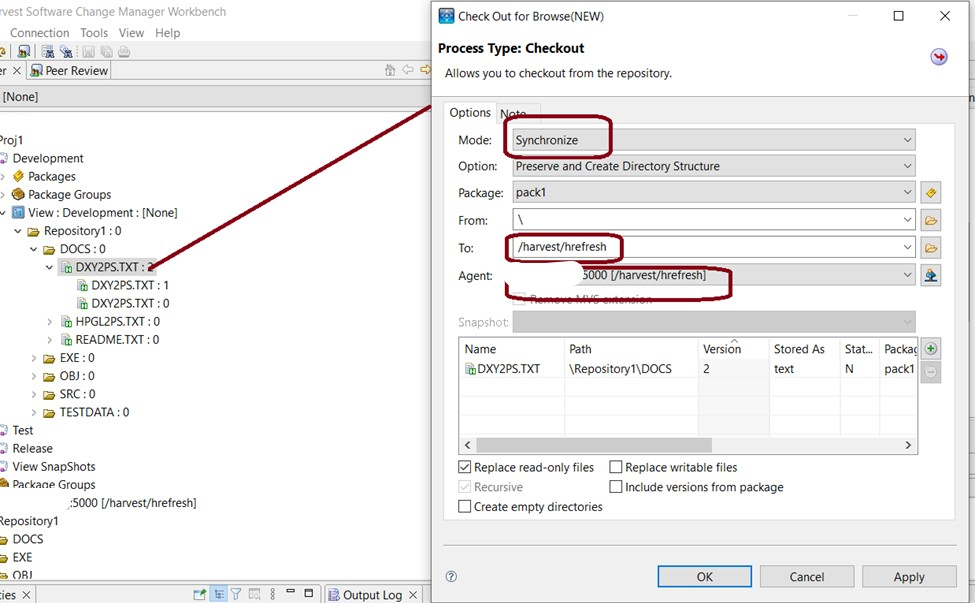 8. The SYNCHRONISE action will sync on the file which has changes. This will work only on the file you intend to deploy. The agent name and 'Check out to location' will remain the same as used in the HREFRESH directory. We are reusing the HREFRESH DEPLOYED FOLDERS and FILES, but will update only ONE intended file through this new process. The change applies to only one file and the complete FOLDER permissions will not be changed