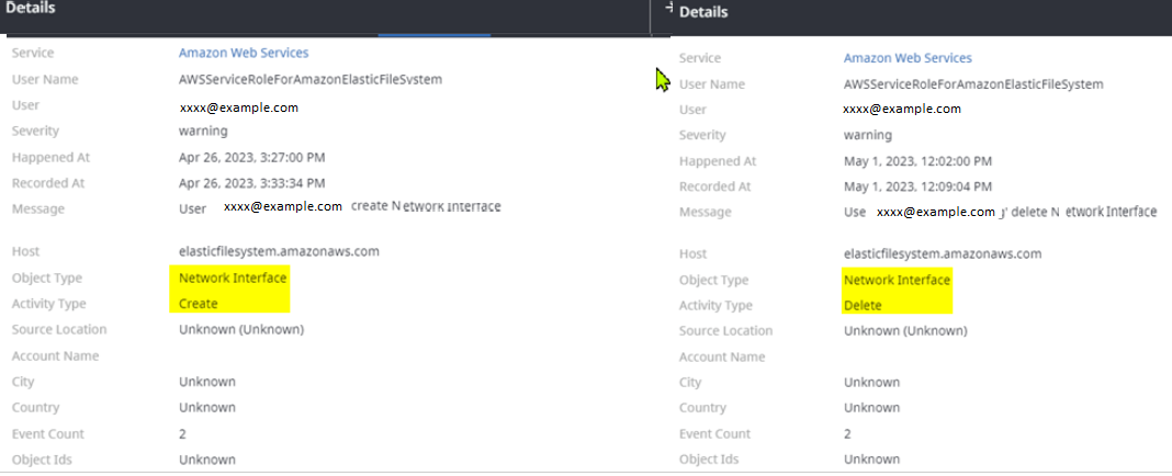The creation (or deletion) of the Elastic File Systems (independent of the endpoints (EC2's) they are mounted only log network activity to the Securlet.