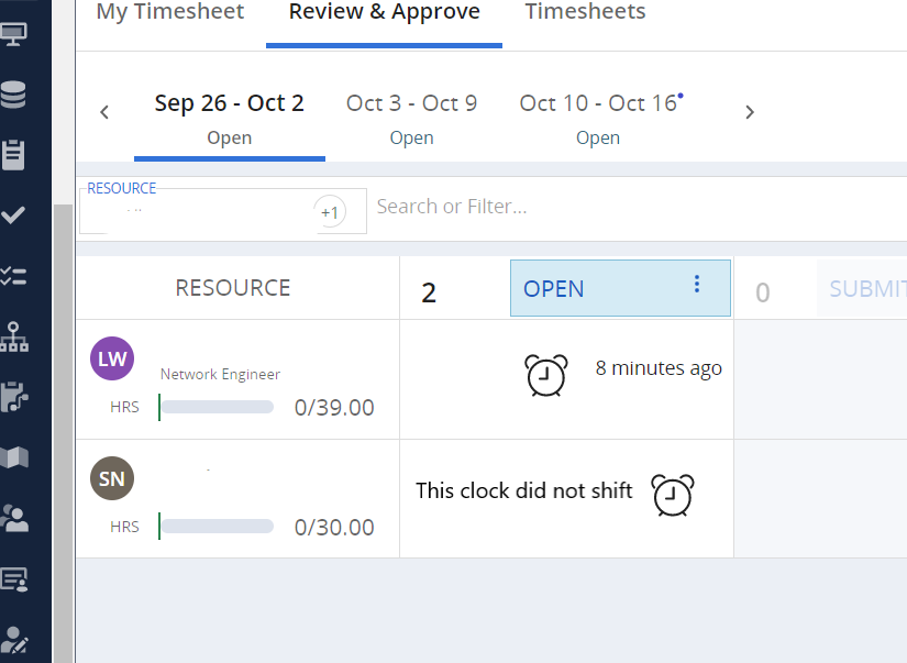 You are on Review and Approve timesheets in Modern UX (MUX). When you click on the clock for a resource you receive a toast message that says Reminder sent, but the clock does not shift. This does not happen with all users.