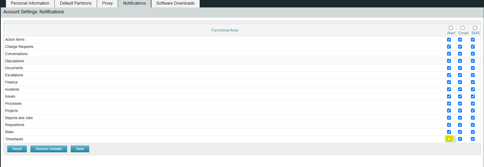 Click on Notifications and check the box for Timesheets under Alerts