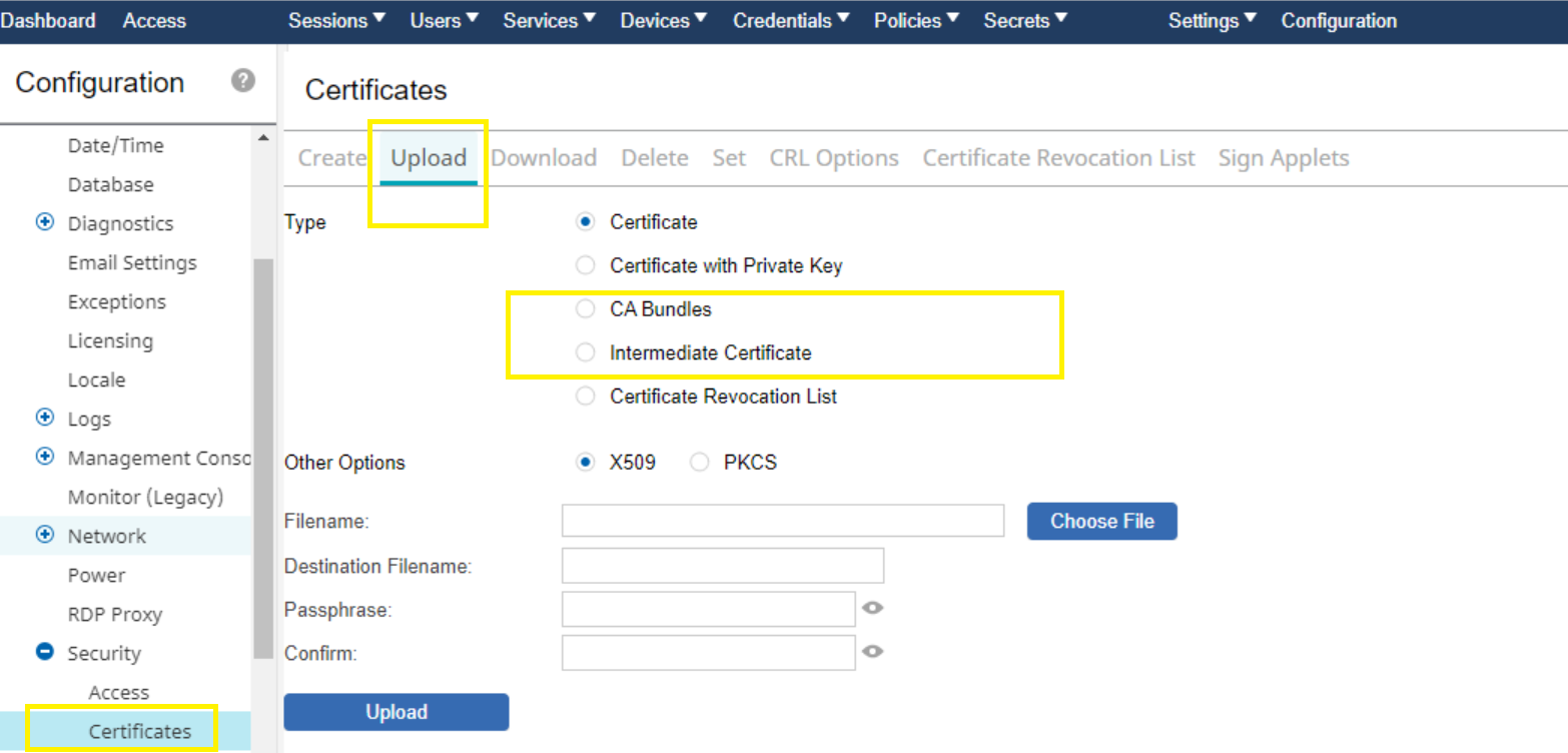 2. If the certificate to be uploaded is an intermediate CA (Intermediate Certificate Authority) then the certificate should be uploaded as an Intermediate Certificate.