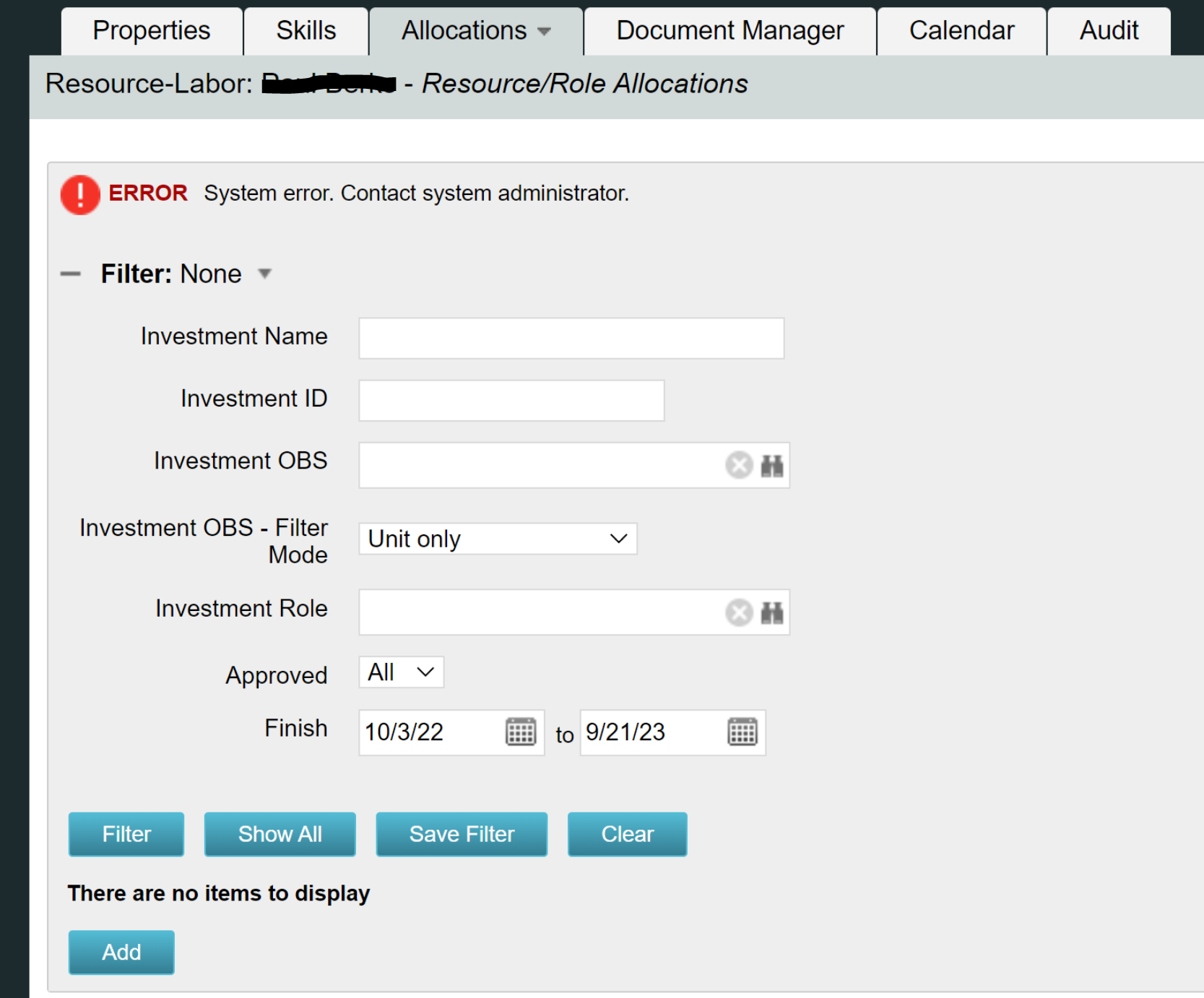 The Resource Allocations portlet throws a system error when filtering on a Date field set on a Date Range format.